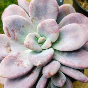 カルテ№286 グラプトペタルム属 ムラサキ🌱 「ド真ん中の日」🏷に参加します🎶 2019年の10月にお迎えした子でもうすぐ丸2年が経ちます🤭2回目の夏越しを絶好調のまま果たし、植えていた素焼き鉢の4号を他の子に譲るために仕立て直して、プレステラ105に着土🎵 お迎え当時と比べてもめっちゃ可愛くなってて(親の欲目です😅)、デビーともまた違うこの色味に飽きません🤩 意図せずにはあまり殖えませんけど、花茎の葉っぱとかで地道に殖やしていきたい子です💜 。* ❤︎… 今日のひと言 …❤︎*。 外れにくいエケベリアの枯葉は、年功序列を守ると嘘のように簡単にキレイに取れます☝️ 「たっちんのムラサキ」タグをタップでこの子の生長記録のみどりのまとめが簡単に見れます😊🎵