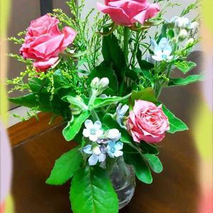 おはようございます😊 先日のバラ🌹に 💙ブルースター 🌿エニシダを 加えてみました🤩 違う雰囲気になるでしょう ✧*。٩(ˊᗜˋ*)و✧*。