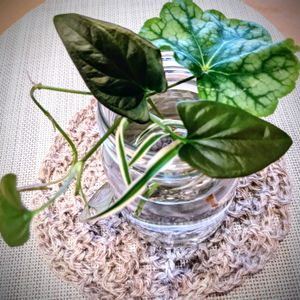 ♡水耕栽培∵🌿 長く伸びてきた シンゴニュームをカット✂️しました。 1種なので、他に何かないかと 探しましたよ。 ありました〜🩷 オリヅルランのベービーちゃん まだ、 足りないな。と思い、ヒューケラの葉を1枚。足して さあ、花友さんに勧められた 水耕栽培をやってみます。 空き瓶は ジャムの空き瓶より、ちょっと大きめのガラス瓶。 あらマア 寒そうですね。 でも、根っこが見えるためにもうしばらく このままに。 その後は ガラス瓶を くるんであげましょう。 デキタ♡❀✵ ♡∴∴∴ 観察するのが楽しみになりました。