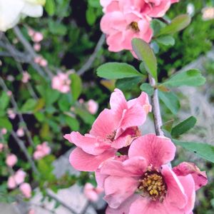 木瓜❀ ボケの花。 グッと 近づいてみました。 あなた、 トゲをお持ち? わたし 痛いの嫌いだからねー、 トゲは引っ込めたままよ。 そうそう。 えっ? ボケさん、 つぶやいた。 折りたたみが欲しい? ..... ❀