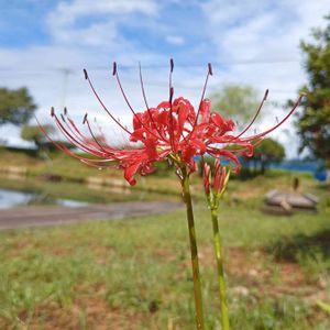 ヒガンバナ(彼岸花)ヒガンバナ科ヒガンバナ属 雨が止んだので公園に花散歩。 ヒガンバナが綺麗に咲いていました。 お花にしずくがついて素敵です。 🏷 真っ赤な火曜日 🏷 0の付く日は雨粒の日