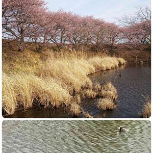 河津桜 池のまわりの河津桜と枯れ草が面白いコラボです。 池に水鳥が泳いでいました。 左の鳥はオオバンと教えて頂きました。
