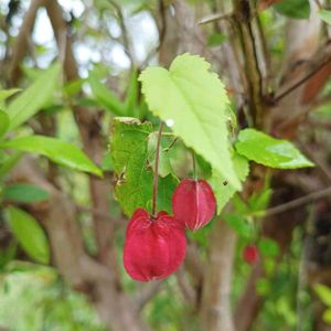 ウキツリボク(チロリアンランプ) アオイ科イチビ属 葉の脇から長い花柄を垂れ下がらせて、赤い筒状の萼が目立ちます。 ランプをぶら下げたような形の色の花を咲かせるそうです。 花は黄色なのですがまだひとつも咲いていませんでした。 🏷 真っ赤な火曜日