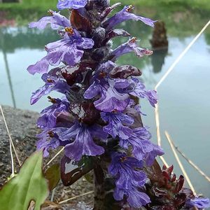 アジュガ(シソ科キランソウ属) ずーっと雨の日が続いていました。 小降りになったので、公園に花散歩。 アジュガが池のまわりに群生していました。