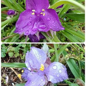 ムラサキツユクサ(ツユクサ科ムラサキツユクサ属) 公園散歩で雨に濡れて可愛いムラサキツユクサに会いました。 花径2~3センチの紫色の三弁花が茎先に集まって咲きます。 早朝に咲いて午後にはしぼんでしまう一日花です。