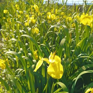 キショウブ(アヤメ科アヤメ属) ヨーロッパ原産の植物です。水域での繁殖力が非常に高く、明治時代に観賞用として持ち込まれて以降、各地で野生化しています。 4~6月に開花期を迎え、先が垂れ下がった、鮮やかな黄色の花を咲かせます。 花茎一本に数多くの花をつけるのが特徴です。 こんなに綺麗なのに要注意外来生物、日本の侵略的外来種ワースト100とのことです。 🏷 日曜ビタミンカラー♪