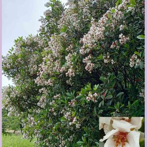 シャリンバイ(バラ科シャリンバイ属) 和名は枝の分岐する様が車輪のスポークのようでお花が梅に似ることからつけられました。 いつも見るシャリンバイは70cmくらいだったので、この大きなシャリンバイには驚きました。 4、5メートルくらいあります。