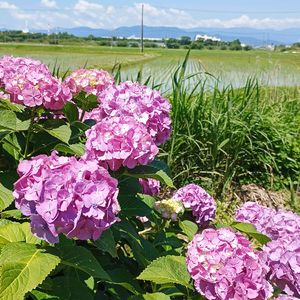 アジサイ 田んぼとアジサイと青空、久しぶりの天気、気持ち良かったです。 🏷 ピンクワールドへようこそ