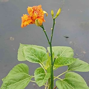 ヤブカンゾウ(ツルボラン科ワスレナグサ属) ノカンゾウの八重咲きのものをヤブカンゾウと言うようです。 まわりの葉っぱは、横に生えてるひまわりですね。 🏷 月曜日にビタミンカラー