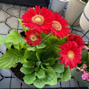 先日投稿したガーベラさん🌼 今やったらいけないのは解っていますが、我慢できずに2周り大きな鉢へ、植え替えてしまいました…😅