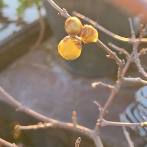 「蝋梅の蕾」 1月13日am6:40 ✧p📷qω•,,´)パシャ やっと蝋梅に蕾が出来ました。3個😊 2022年1月に購入した蝋梅、樹齢が分からなかったので、購入してから直ぐに問い合せたところ、3~4年生という事でした。 ネットの検索では、蕾を着ける様に成るのは5年生からと出ていました。 なので、購入した時が3年生だったのですね。 鉢植えで育ててます。 今までに、2回ほど鉢増しをしました。 今年もふたまわりほど大きな鉢にしてあげようと思ってます。 根っこをいじられるのが嫌いなので、そっと大きな鉢に移して底とガワの土を足していってあげよっと思います。 植え替えに、凄く敏感のようです。 やっと3個の蕾ですが、もっと大きく育ってきたら沢山咲いてくれることでしょう。🥰 楽しみです🎶☺️