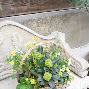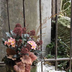 スキミアの寄せ植え スキミア、ビオラ、プリムラジュリアン、パンジー、ネメシア、カレックス、カルーナ、ユーカリ