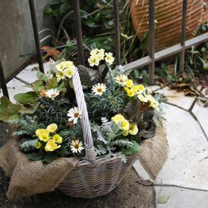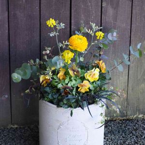 ガーデンメッセ教室で生徒さんが作った寄せ植えです。イエロー、茶、黒の組み合わせです。 ラナンキュラス、ビオラ、ユーカリ、コクリュウ、コロニラ バレンティナ