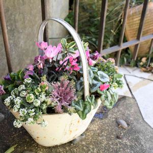 グリーンギャラリーガーデンズ教室で生徒さんが作った寄せ植えです。 ガーデンシクラメン 、アリッサム、ハボタン、ビオラ、コクリュウ、ヘーベ