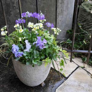 寄せ植え プリムラマラコイデス湖畔の夢 ネメシア パンジー ベアグラス ヘデラ