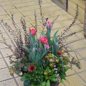 チューリップの寄せ植え 春咲くチューリップより長く花を楽しむことができます。 チューリップ、ジャノメエリカ、ギョリュウバイ、プリムラ ジェシカ、ティアレア