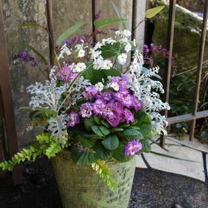 ローダンセマムとプリムラの寄せ植え ローダンセマム、プリムラ、ティアレア、シルバーレース