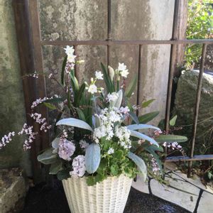 スイセン ペーパーホワイトの寄せ植え 注文品です。 スイセン ペーパーホワイト ハーデンベルギア パンジー プリムラ セネシオ エンジェルウイングス エレモフィラ ニベア エスペレティア