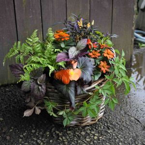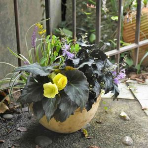 球根ベゴニアの寄せ植え ヤブラン、コウシュンカズラ、球根ベゴニア、プレクトランサス モナラベンダー