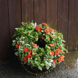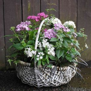 ペンタスの寄せ植えです。 ピンクの濃淡と白のペンタスとコクリュウ、ハゴロモジャスミンで簡単に花籠を作ることができます。
