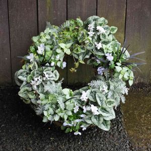 ビオラのリース 直径30センチのツルのリース型です。 ビオラ×3 アリッサム×3 ロータス ×3 シロタエギク×2