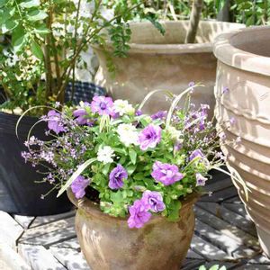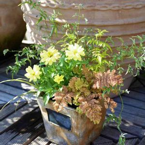 寄せ植え このブリキ容器は植え難いです。 でも素敵です。