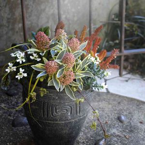 スキミア マジックマルローの寄せ植え スキミアマジックマルロー、カルーナ、イベリス、ルメックス、ヘデラ モコモコ、カレックス