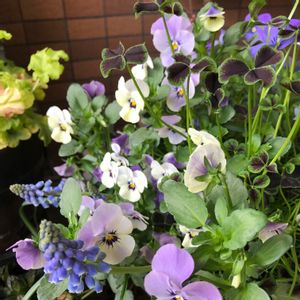 なんだか乙女な寄せ植えになってたな。 今はムスカリは終わり、ビオラからペチュニア に変更。 2018.3