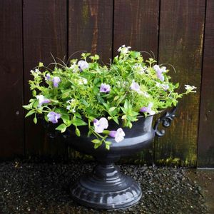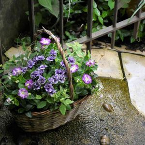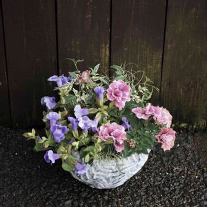 ペチュニアの寄せ植え ペチュニア、ブラキカム、カレックス、五色斑ナツヅタ