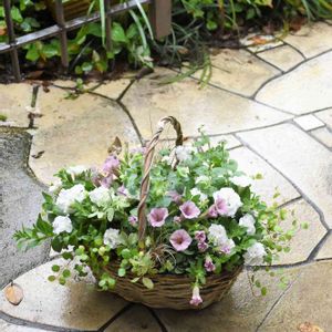 八重ペチュニアの寄せ植え ペチュニア、ロベリア、アジュガ、コクリュウ、クローバー