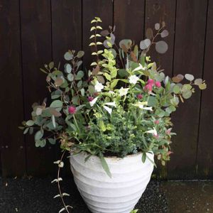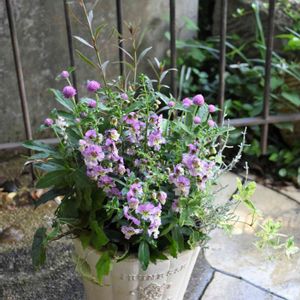 インカビレア、ユーカリ、センニチコウなど 手入れが楽な寄せ植え