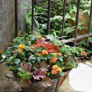 ランタナとジュズサンゴの寄せ植え バケツ形の容器は2年くらい使って小さな穴が開きました。