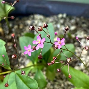 もう一枚、ピンクの花を🎵 ハゼラン(サンジソウ)💗 何年前か職場の花壇から2、3本もらって帰ってプランターに植えて、毎年芽が出て咲いてくれていたのですが、今年は中々出てこなくて、暑すぎて駄目なのかなぁ~😅と諦めかけていたら、葉っぱが沢山出て、2日前早出で帰った時、この一本だけ咲いてたんです🎵 小さな小さな花なので、よく見ないと見落としそうなのですが、車を降りて家に入ろうとして玄関横のプランターの緑の葉っぱの中に、この子1本だけ咲いてくれてました🎵 思わず、あっ、咲いてる~🥰って声に出してしまいました🥰 小さいのに精一杯、ここに居るよって知らせるように開いてるんです🎵 今年も会えて良かった~🥰 可愛い花です💗