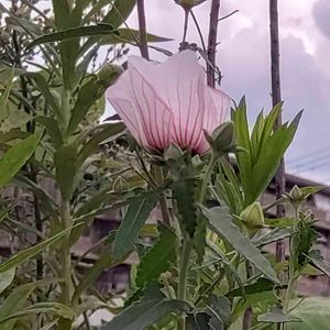 矢の根梵天花 別名 タカサゴフヨウ(高砂芙蓉) ミニ芙蓉 お花が梵天花に似ていて鏃(やじり)のような葉を持たことからつけられたそうです 花言葉 繊細な美しさ 薄く和紙を漉いたような透明感のある花びら