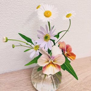 おはようございます✨ 🌸が満開でお外に出かけるのが楽しみな季節になりました😊 こちらの作品は 先日幸田町で行われた SDGsマルシェで飾らせていただいたものです😊 娘の愛凜の作品はクリーム色のラナンキュラスの作品です☺️ 春風が強すぎてヒヤヒヤの展示になりましたが💦💦 現在一部を 幸田憩の農園様にて展示中です😊 来週は久しぶりの農園様でのギャザリング体験です😊 のんびり楽しみます♩