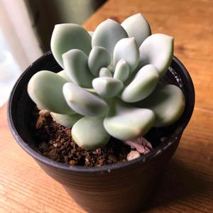 同一人物とは思えないのですが😆 この子は、9月23日に お迎えした銀天女ルスビー 葉っぱにちょっとしたキズがあるのが特徴の 小さめの子でしたが 暗めの葉の色に一目惚れして お迎えしました。 4ヶ月が経ち、寒い冬になり。 すっかり葉の色も変わってしまいました。 が。 大きくなったー😍 キズがあったところから上に 葉っぱの数が増えてるー♥️ お子様もいてるー♥️ この鉢に植え替えた時には 鉢デカすぎたかー❓と思ってたけど 鉢から葉っぱがはみ出てきてる😁 大変よろしい。 でも、伸びてきてもてるけどね😝