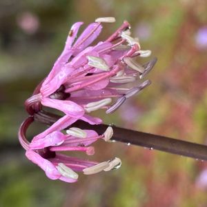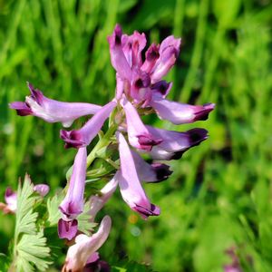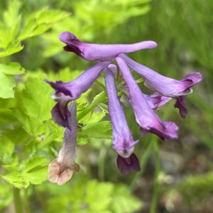 ムラサキケマン 鞘が弾けて丸まった🌀 握り混んだ時に掌をくすぐられる感じと、この姿が見たくて、庭に咲いても抜かずにいる(๑´∀`๑) ケマンの仲間なので合着している花弁の形はエンゴサクそっくりだけれど、総状にびっしりと花を付けるところが違う💜 後ろに伸びている距には蜜が溜まっている✨ ガガンボが訪れていて、なるほど口吻の長いムシでなければ吸えないだろう(^_-) 苞葉は鋭く切れ込み、下の葉は2~3回羽状に細かく裂けている🟩