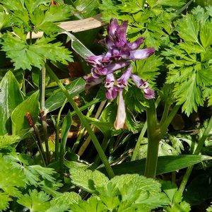 ムラサキケマン(紫華鬘) ケシ科 キケマン属 名前の由来 花色が紫色で、花の形が仏殿に吊るす仏具の華鬘(けまん)に似ている事 日本全土に生育し、木陰や林縁のやや湿った場所に生える 花期 4〜6月 1️⃣2️⃣高さ30〜50cmで上部に筒状の花が咲く。花の後方には距があり蜜を溜めている 3️⃣前方には上下に紅紫色の唇形の花弁がある 前方中央には左右から合わさった白い花びらがある この中に雄蕊と雌蕊があり、虫媒花であるので、蜂が白い花びらを超えて蜜を吸う 下唇に乗った蜂の重みで花びらが下がり、雄蕊と雌蕊が露出して蜂の体に接触する 4️⃣蕾 花は最初斜め上向き 5️⃣葉には深い切れ込みが沢山ある 自然界の計算された花の作りに驚かされます❣️ ホトケノザやヒメオドリコソウの下唇もこんな感じですね❣️ ケシ科の花だから有毒です❣️