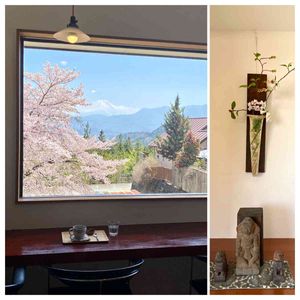 富士山を望むお気に入りの山の上のカフェ☕️ 山裾は葉桜、でも桜の開花中(ソメイヨシノ)に間に合いました^ ^ 陶芸家のご主人の素敵な壁かけの花瓶には キブシと桜が生けられていました🌿