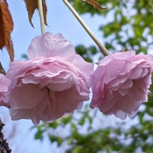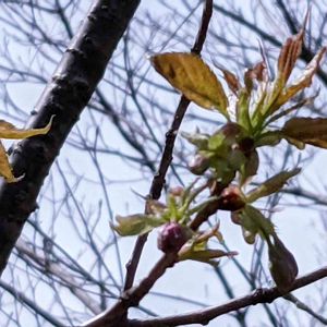 こちらは鬱金桜ウコンザクラです。エノキの大木の下の小屋に近いので、富士桜とともに雰囲気の落ち着いた桜を植えました。…が下枝も余り無く、お花が咲き始めたのも気付かなかった年も…😓 流石に今年はGS効果で?!何度も見上げていました。ようやくピンクの蕾が見えるようになりました。お花が開くと黄緑がかったクリーム色、真ん中にポッと紅が入ります。