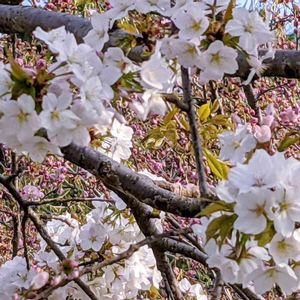 左、枝垂れ桜 右、松前桜 中、ジューンベリー 河津桜はすっかり終わり、富士桜は終わりかけ、松前桜と鬱金桜がぼちぼち、最後に空に向かって伸びる天の川が咲きます。庭が一番華やかな季節です。