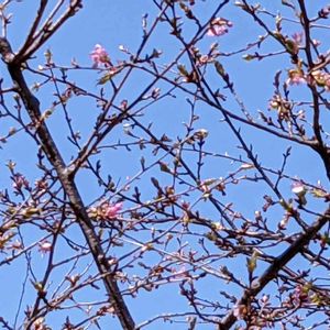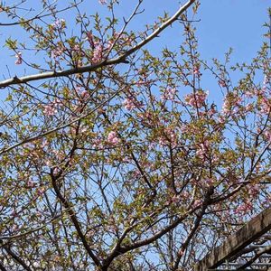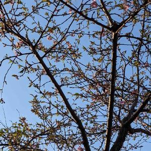 庭を歩いていると、あれっ!上を見上げてよくよく捜すと、咲いる咲いてる、河津桜がポチポチと!🧐😲🌸
