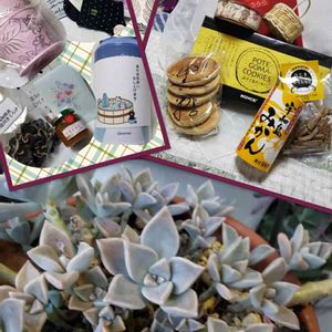 10月✨1枚目は~💓 昨日 クリスちゃんから ご褒美を頂きました❣️ 子持ち蓮華錦➰🍀 白菊の舞✨ マクドガリ💚 福娘💗 桃色カリシア🍑 そして 沢山の美味しいもの💕 ランチを過ごしたカフェのテイクアウトコーナーに わらび餅を発見👀✨~✨ 美味しそう😂って私の呟きを聞き逃さない クリスちゃん🥰 買ってもらったぁ🤭✌️ 植え替えしなくて良いように📛も付けて持たせてくれたの🎶 私がメロメロになるのわかるでしょ😆☝️💖 今月も元気と笑顔をお届けできますように❣️ 宜しくね🍀➰🍀