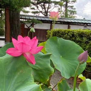 御殿場市のお寺の境内の蓮 艶陽が咲いてきました❣️ 毎日15鉢の内、いろいろな違った蓮の花が咲いていて この世の極楽浄土のようなお庭は、夏の間の天国です