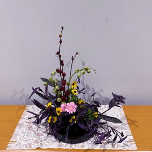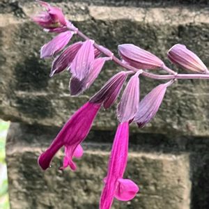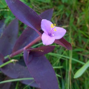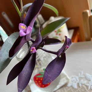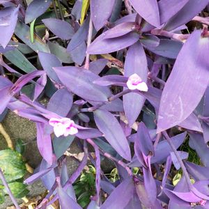 こんにちは☁ 葉は紫色の長楕円形で お花は桃色 美しい草姿のムラサキゴテン