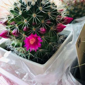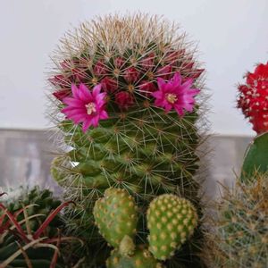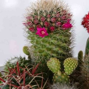 以前ダイソーで購入しました。マミラニア属かと思いますが、赤い色の花の蕾のようなものが出てきました(^∇^) 冬の間外に出していたら下の方が黄色くなりました💦 このサボテンなんという名前でしょうか?