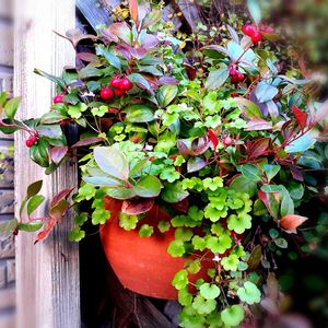 かれこれ2~3年 そのまんまの、 寄せ植え 葉の紅葉が、可愛いです (液肥、葉の整理はしてます) チェッカーベリ ーの赤い実🔴は 、少なめですね~💦