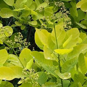 ライムグリーンの爽やかな🍃 💚スモークツリー💚の 花芽が出て来てます〜🥰🎶 庭で一際輝いています❣️ 雨粒も✨✨✨