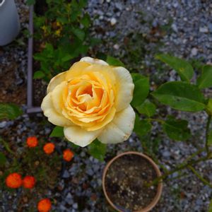 お花いろいろ 今日は久々の雨です☔️雨に弱いホワイトクリスマスは車庫に。運ぶ時、やっぱりフルーツの良い香りでした🍑でもやっぱり白じゃなくて黄色っぽいです😅 朱色の薔薇は今朝綺麗な形で咲いてました🌹✨