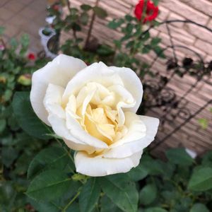 ホワイトクリスマス♡ 水曜ローズショー🌹 玄関横でで真っ赤な イングリッドバーグマンと共に 開花中😊